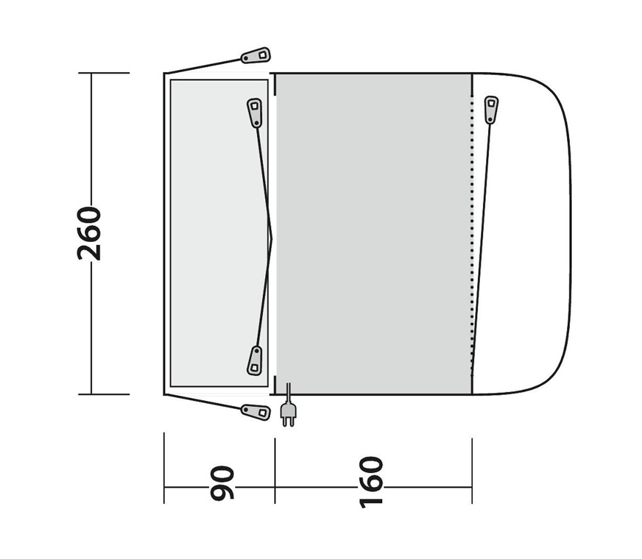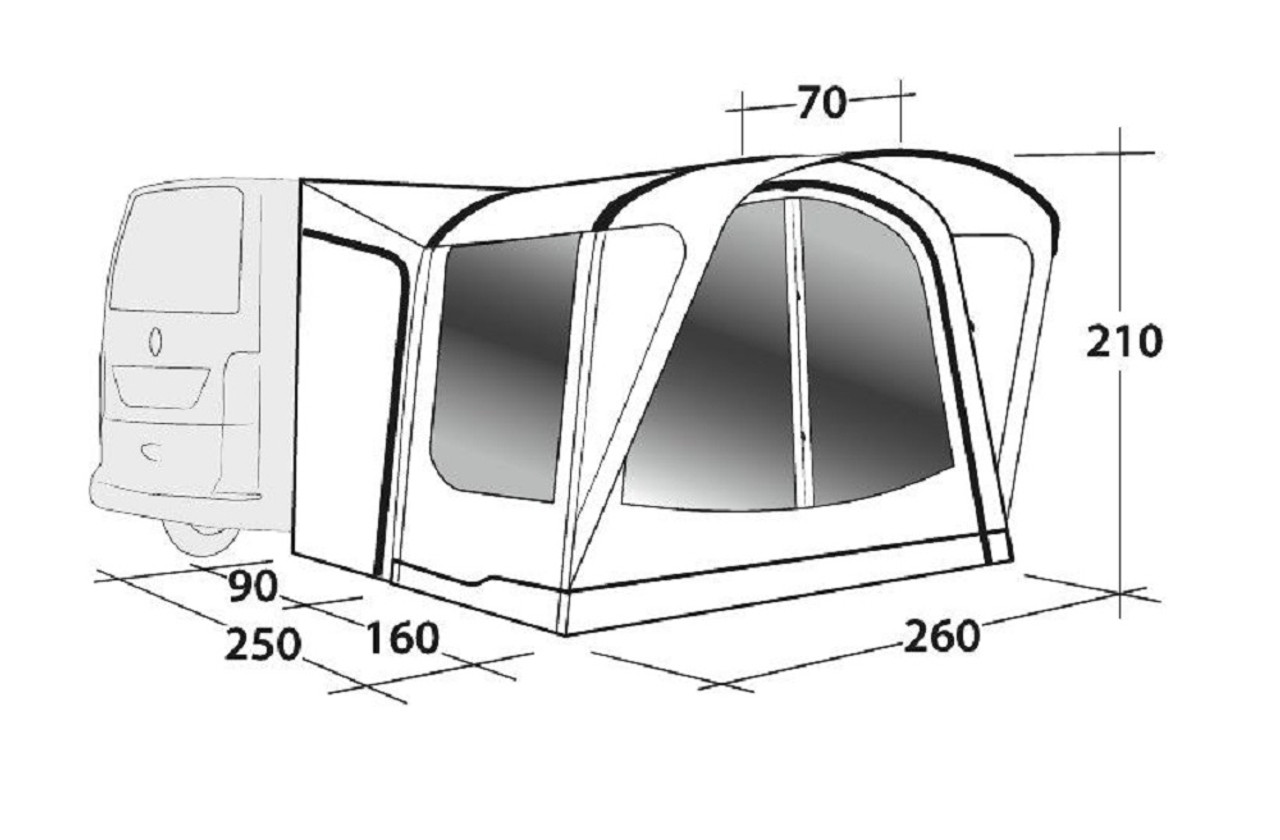 Outwell Newburg 160 drive away awning is designed for use with VW, Ford Transit and similar sized campervans. This easy and quick to pitch drive away awning features a spacious living area ideal for additional living space or storage during camping trips and holidays. The Outwell Newburg 160 drive-away awning is a tunnel tent style awning with a central inside pole along the roof line, side access via doors at the front and back of your campervan and has a height range of 175cm-200cm via beading options (5mm and 7mm).