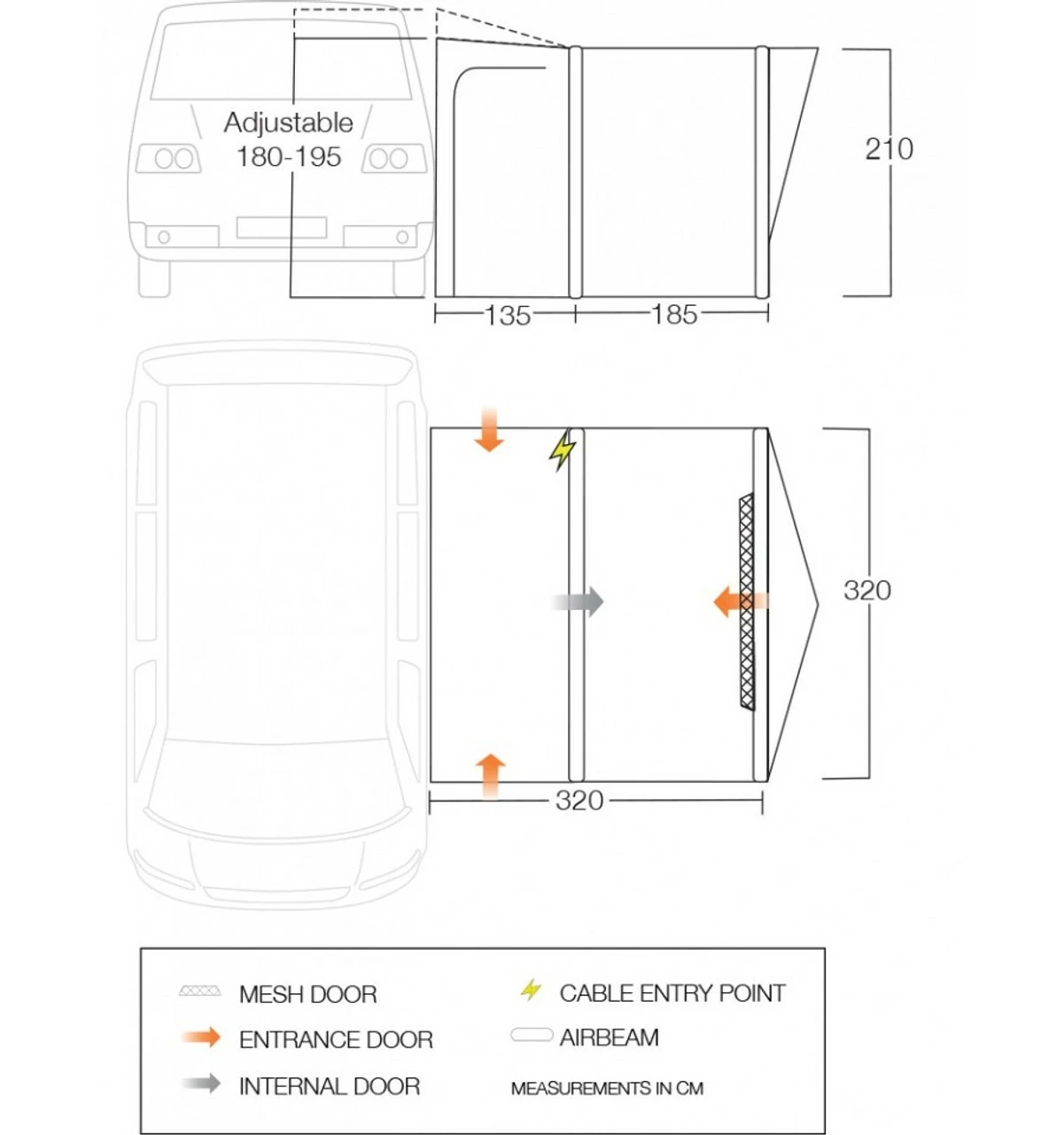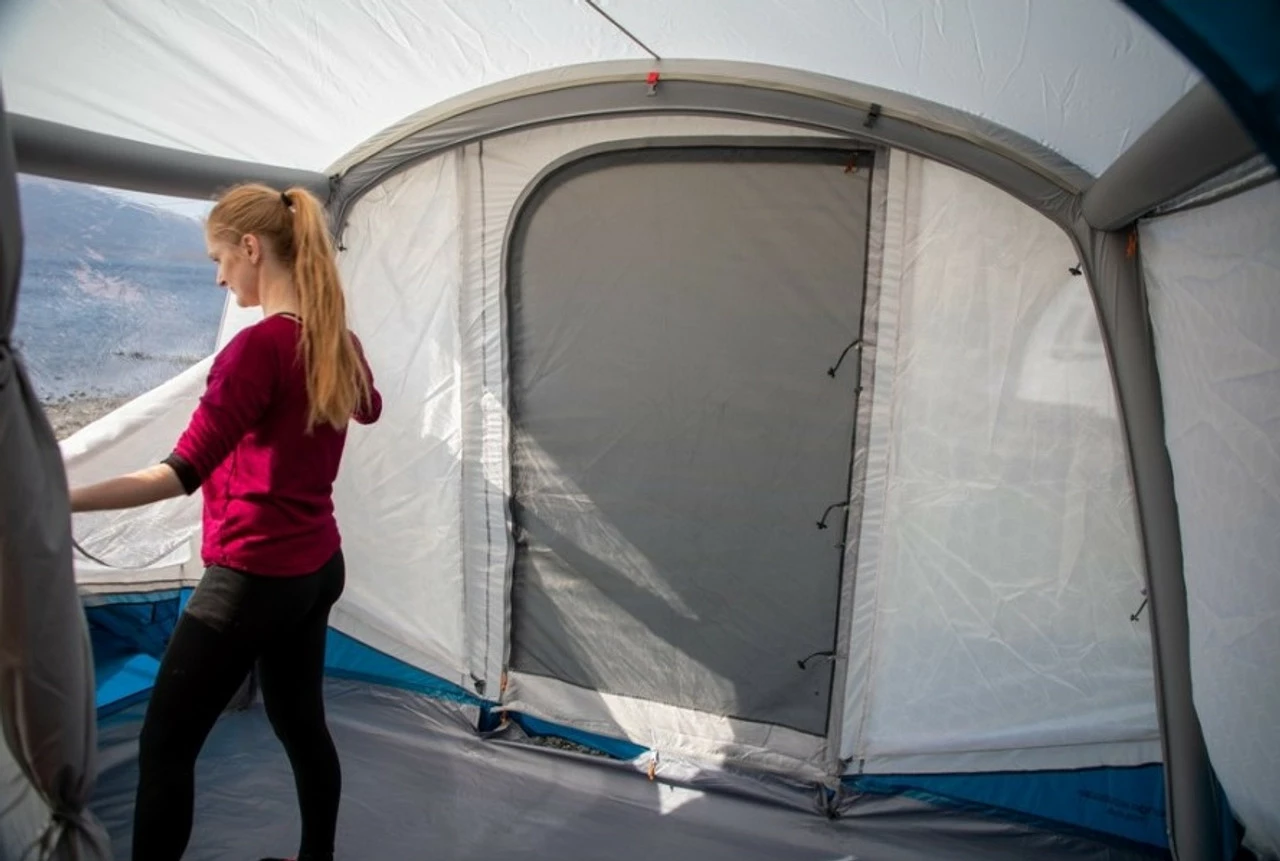 The Vango Tolga Drive Away AirBeam awning tent is designed for VW T5, T6 and similar size campervans and conversions. Using Vango’s AirBeam technology the Tolga awning is simple and fast to inflate, combined with Sentinel Sport fabric which is strong durable and waterproof and uses ColourLok technology to reduce the effects of UV. The large front door on the Vango Tolga AirBeam Awning ensures that when the sun shines, you can roll back the door and catch those sunrays, but with the option to zip close the front mesh door to keep out the bugs. The connecting tunnel has a door at each side and provides ample storage space for bikes and muddy boots. Vango’s Tolga drive away campervan awning is perfect for couples and families on their adventures.